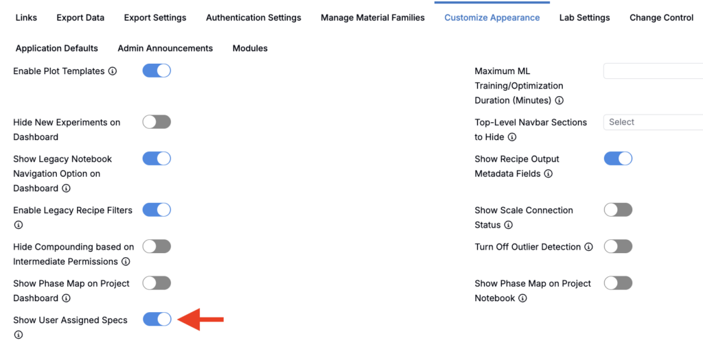 To enable user assigned specs within a schema, admins can toggle on Show User Assigned Specs within the Customize Appearance tab of the Company-Wide Settings page.