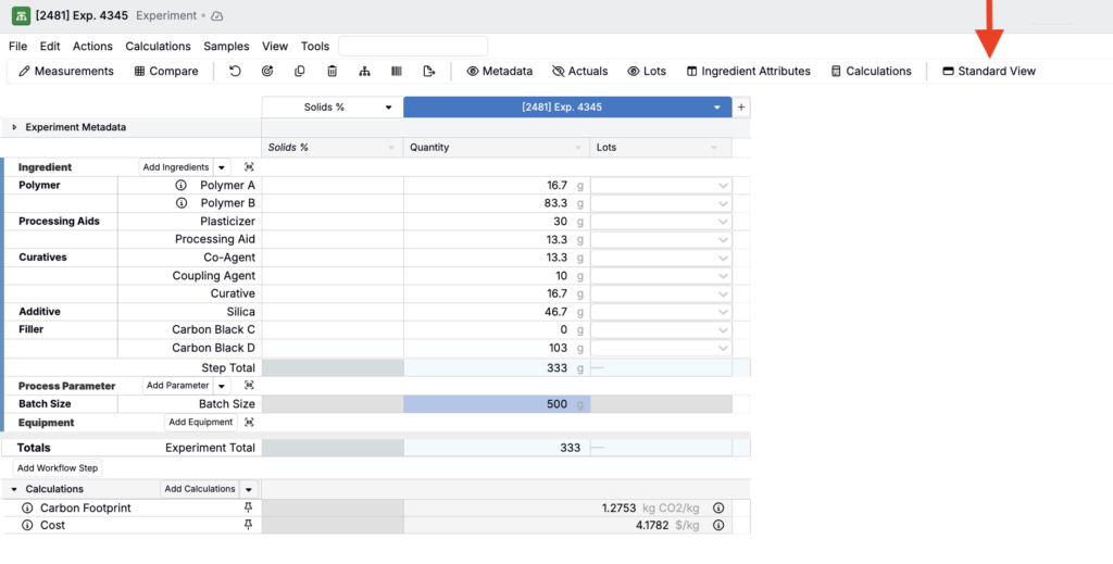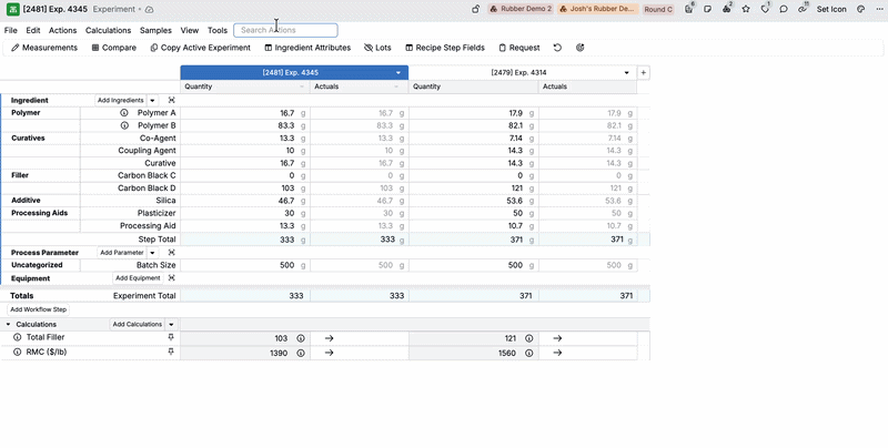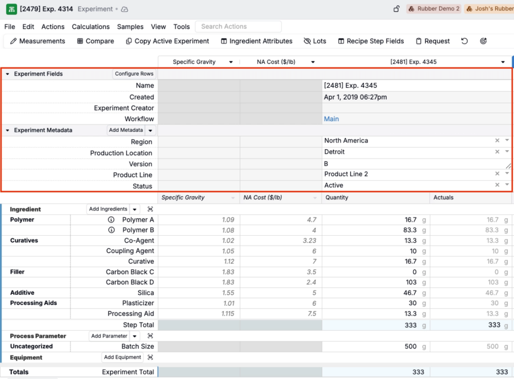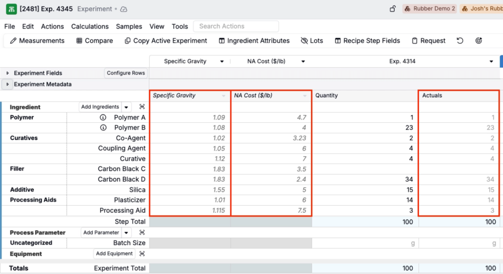 - Rubber formulations: show Actual Value, Batch Weight, Cost, and Specific Gravity.